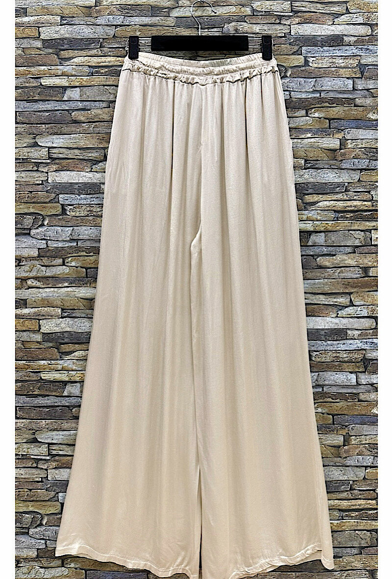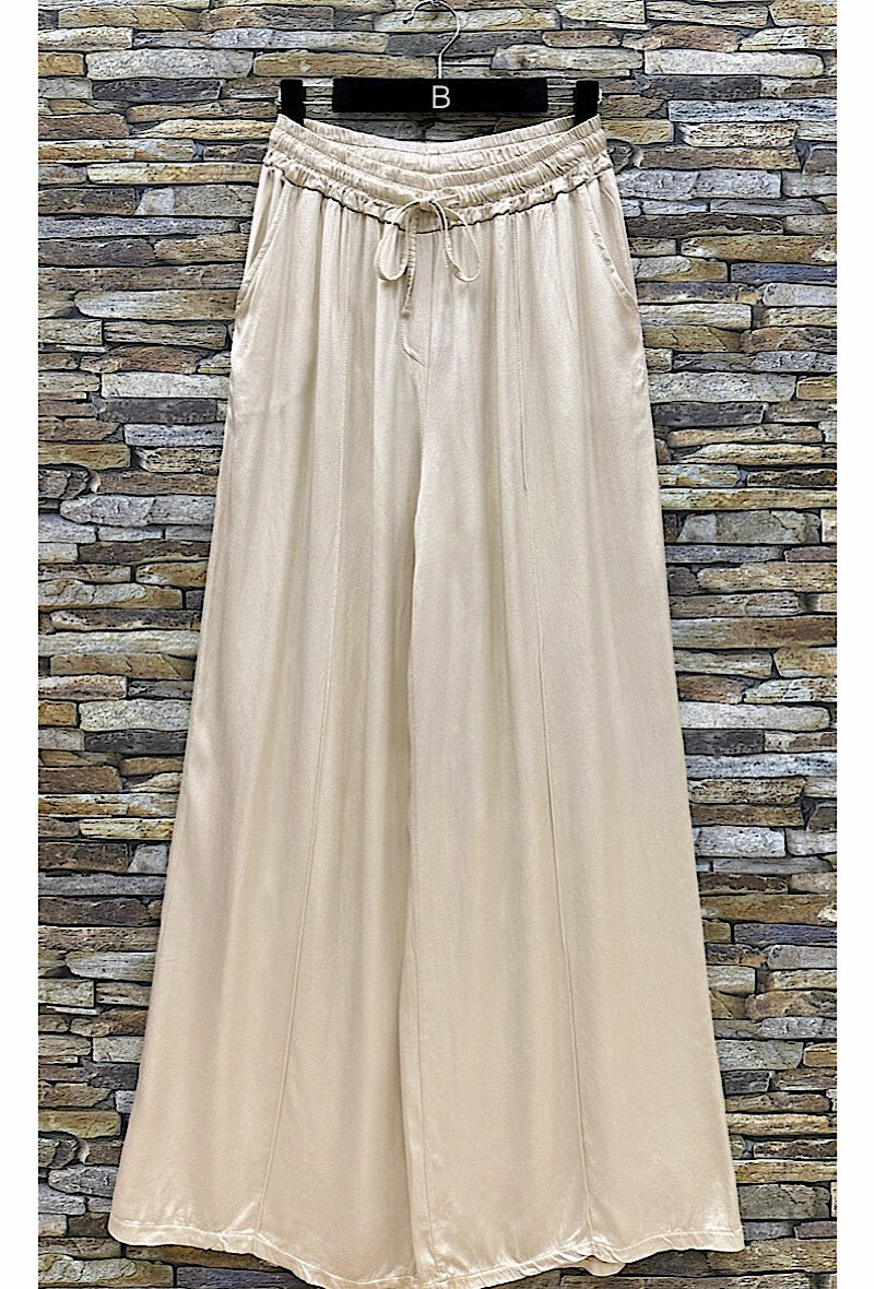 Muodikkaat, mukavat ja hyvin laskeutuvat yhdenkoon suorat leveälahkeiset satiinihousut viskoosisilkistä. Taskulliset.